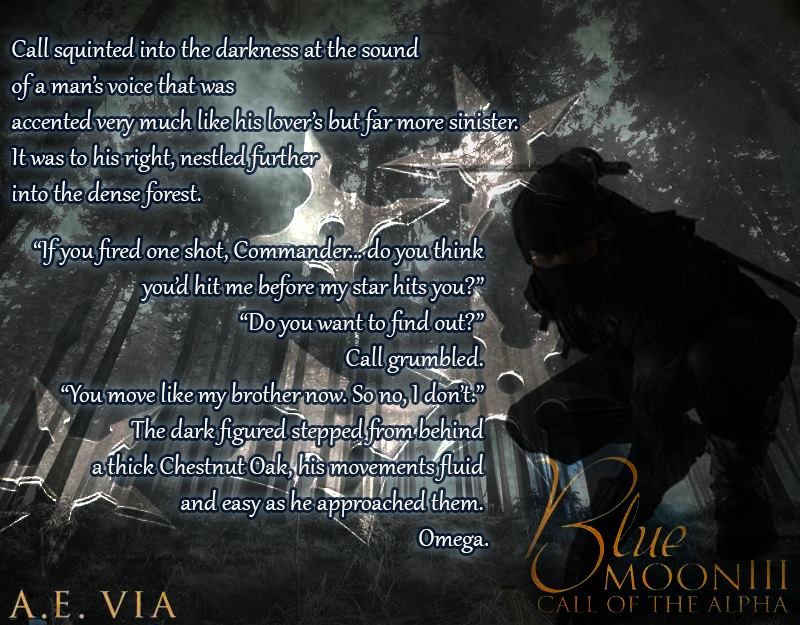 Call leaned back and rested his elbows in the soft soil, staring up at his partner. The moon had emerged from behind the dark clouds, just in time for him to feast on Alpha’s beauty. He shook his head. He had to stop doing this to Alpha. They’d been together two years now. How many times did he need to be reassured that Alpha wasn’t in love with the marred skin which covered the entire left side of his body? He was in love with the man within.